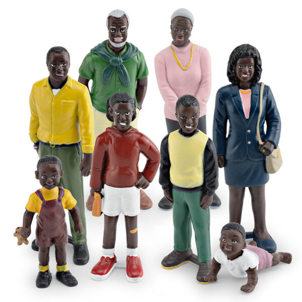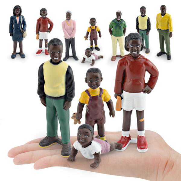 This is a set of PVC miniature sculptures representing an African American family, meticulously hand-painted to showcase realistic details. The set features multiple generations, including grandparents, parents, children, and a baby, each depicted with unique clothing, facial expressions, and poses. These figurines are ideal for educational purposes, storytelling, diorama decoration, or cultural representation.