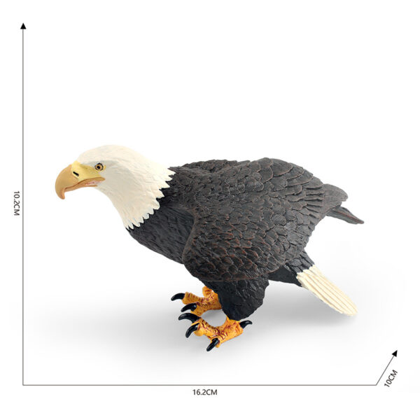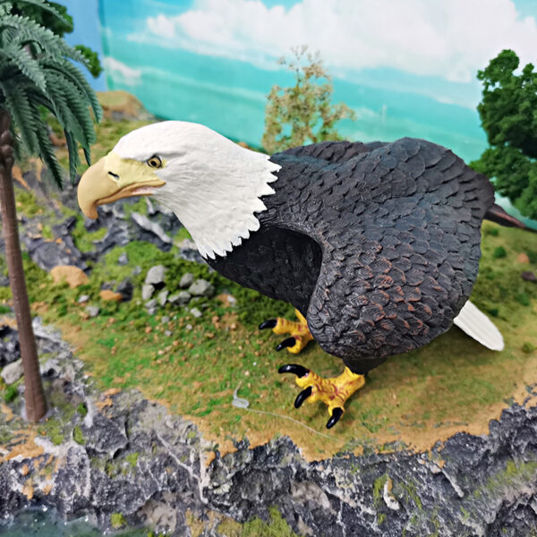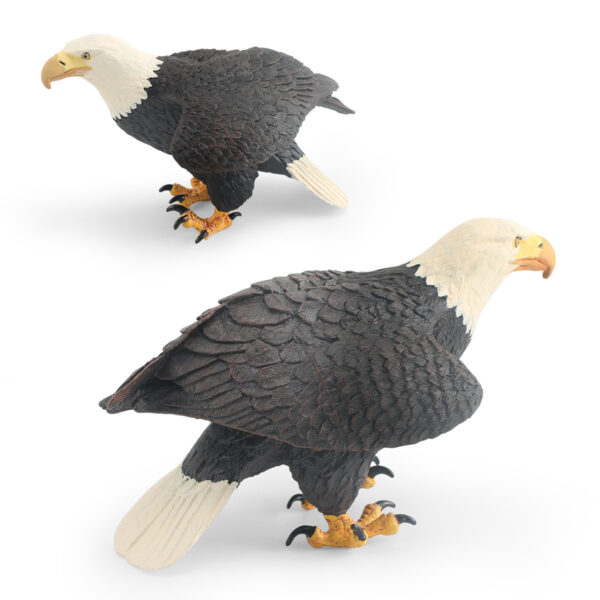 These PVC realistic miniature sculptures represent the majestic Bald Eagle, carefully hand-painted to capture the intricate details of their iconic plumage. The sharp contrast between the eagle’s snowy white head and tail feathers, and its dark brown body, is vividly portrayed.
