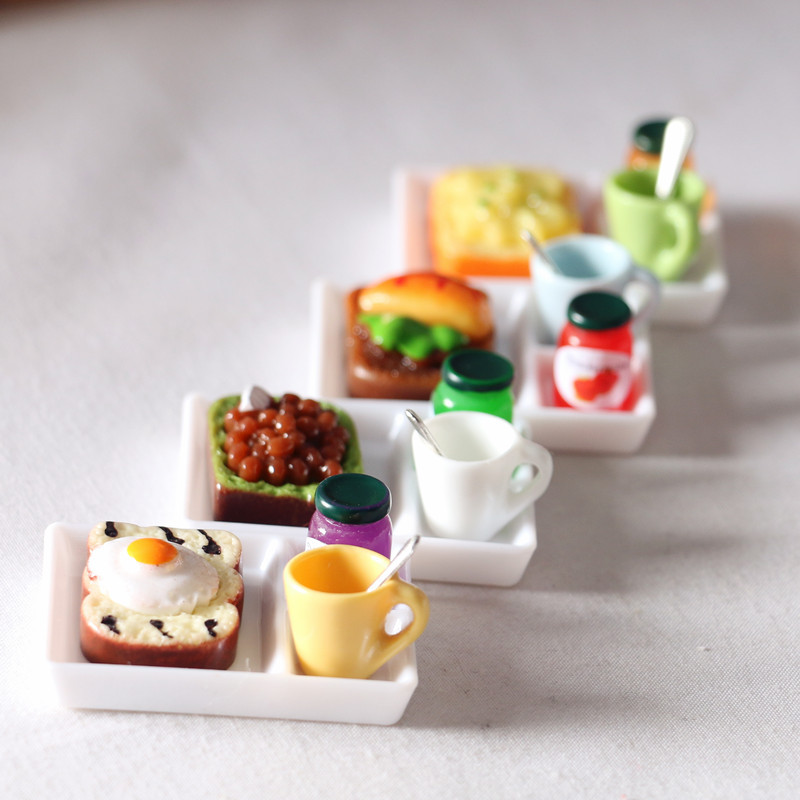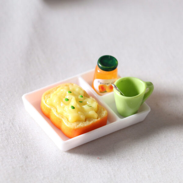 The breakfast toast set is a finely crafted miniature food model themed around toast. Each set includes different flavors of toast and related accessories (a plate, a water cup, a spoon, and a jar of jam).