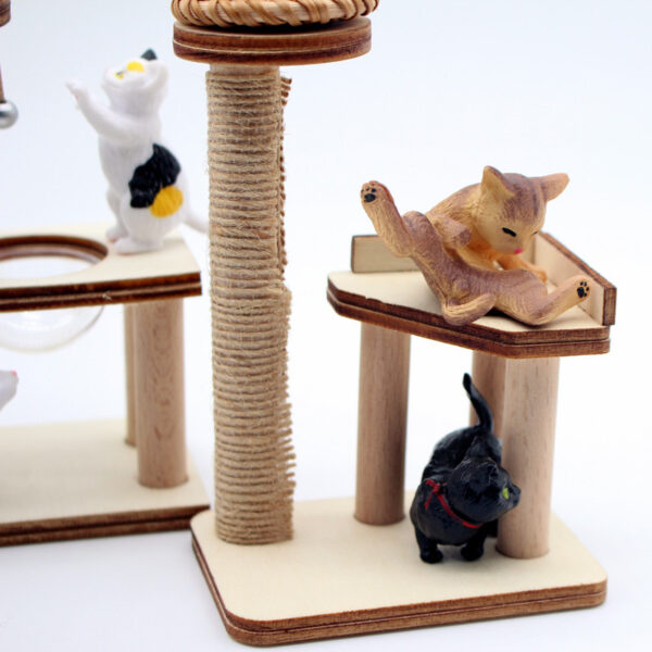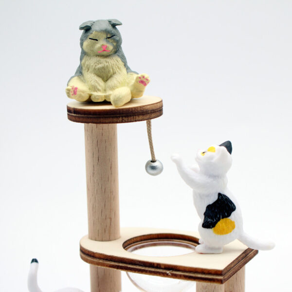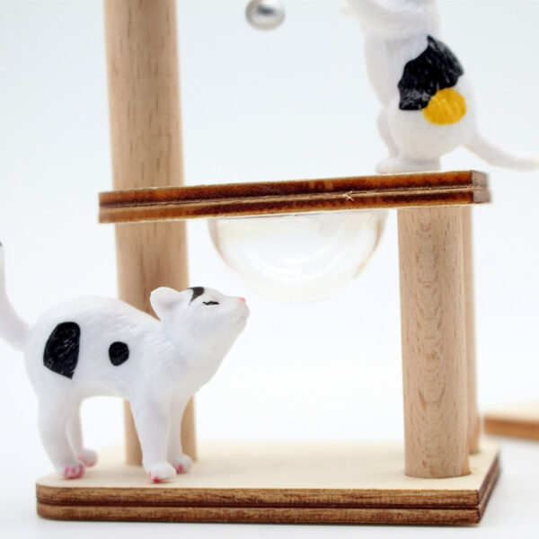 The cat trees are designed with wooden platforms and small accessories like a hanging ball or a woven cushion. Each set includes 1 cat tree and 3 cats in various playful or relaxed poses, allowing you to use your imagination to place the cats anywhere on the tree. The miniature will come in separate pieces with a tool kit and require assembly.