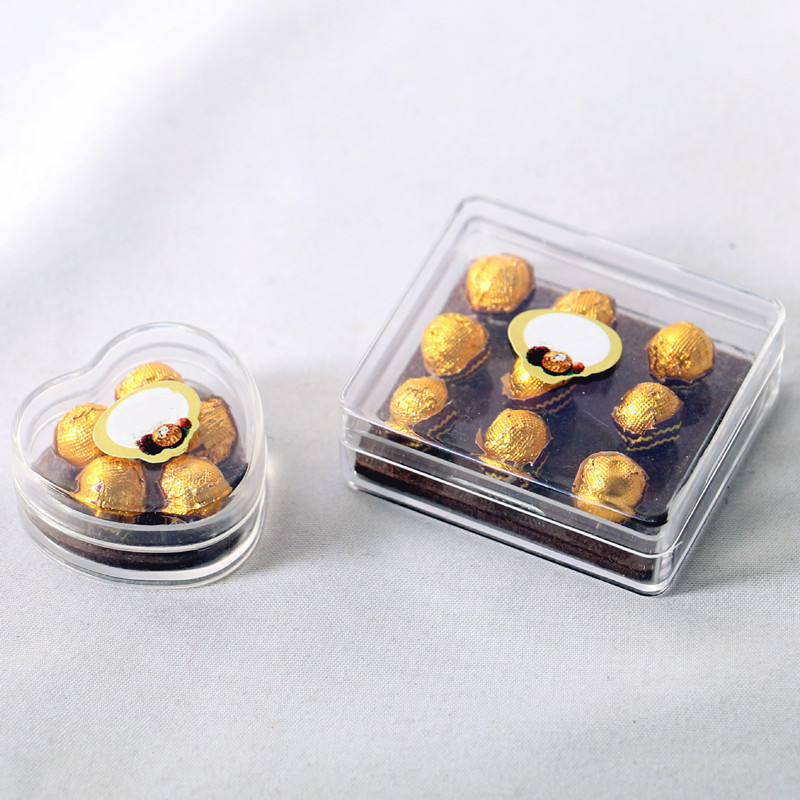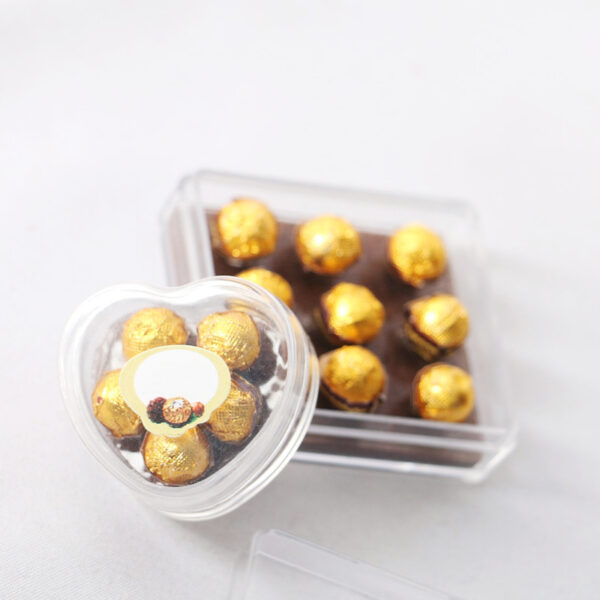 The chocolate boxes are transparent with decorative stickers on top and appear elegant and perfect for gifting.
