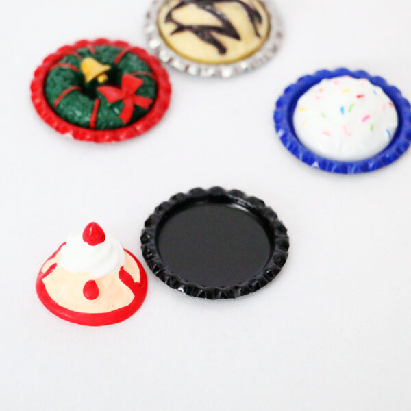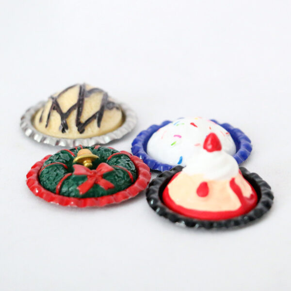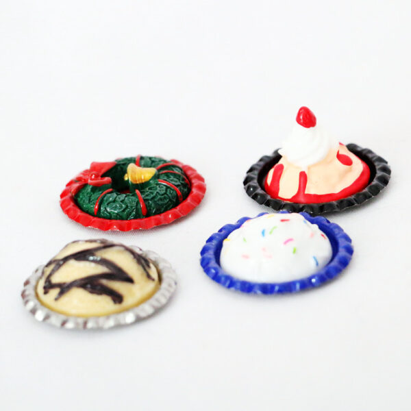 Dimensions | Blue and White Cake (1.4" x 1.4" x 0.4"), Yellow and Black Cake (1.4" x 1.4" x 0.4"), Red and Green Cake (1.4" x 1.4" x 0.4"), Red and White Cake (1.4" x 1.4" x 0.4") |