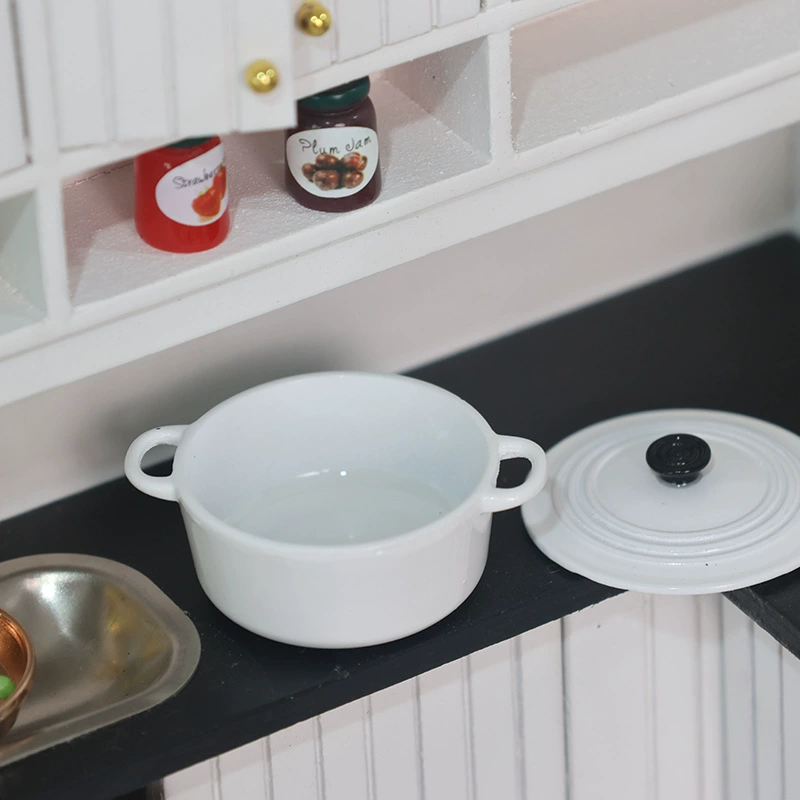 This is a dollhouse miniature enamel cast iron pot, made of metal alloy, perfectly replicating the look and texture of a classic enamel pot, suitable for dollhouse kitchens or miniature cooking scenes.