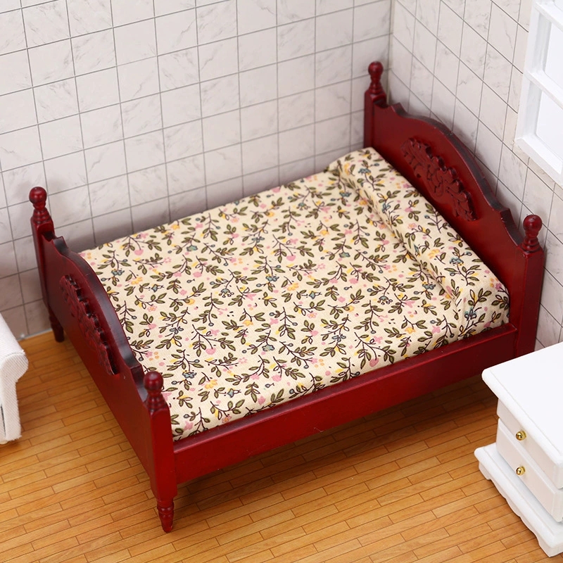 The charming wooden bed features delicate carved detailing on the headboard and footboard, suitable for creating various styles of dollhouse bedroom scenes.