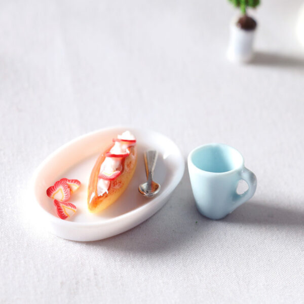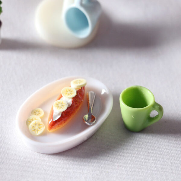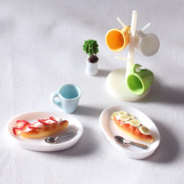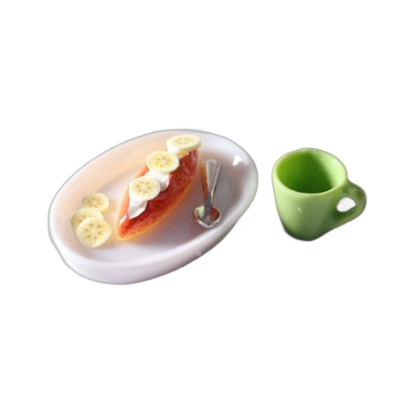 The miniature French fruit bread set serves as an aesthetically pleasing decorative item in dollhouses. It includes a plate, a spoon, a cup, a piece of bread and 3 fruit slices.