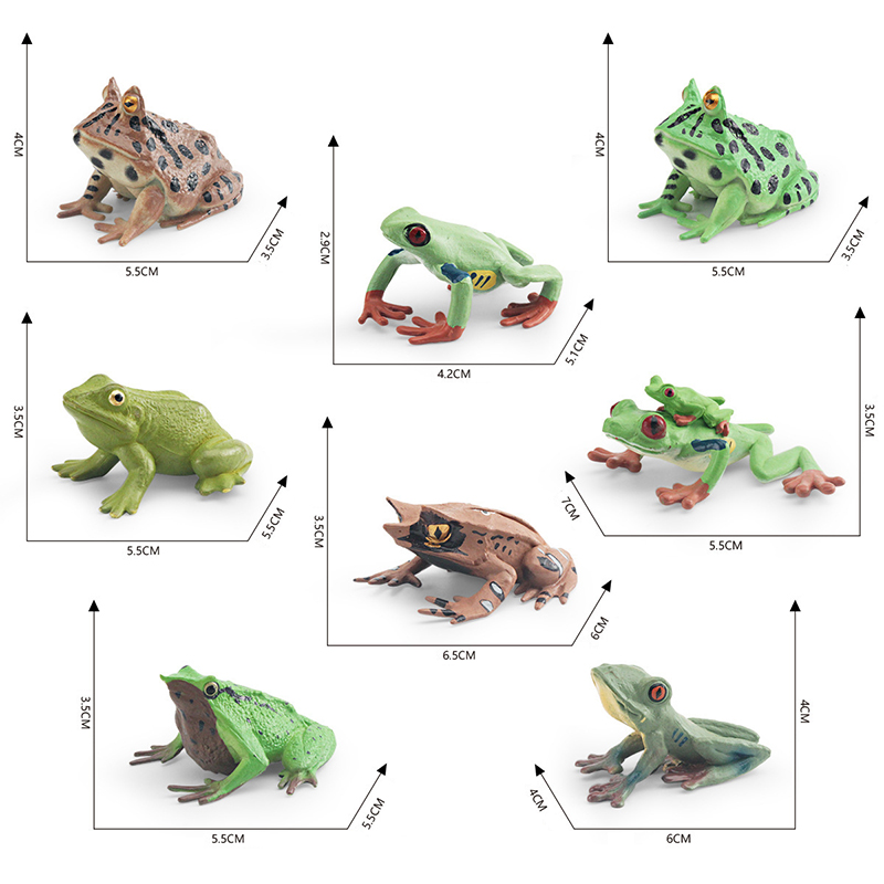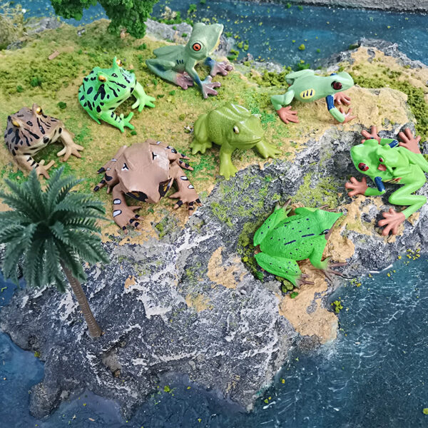 These are PVC miniature sculptures representing various species of frogs, hand-painted with attention to detail. These figures showcase a variety of poses and realistic colors, bringing each frog’s unique characteristics to life.