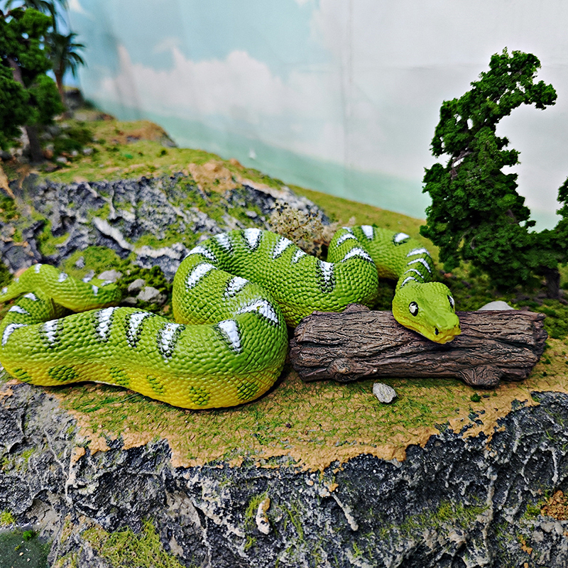 The dollhouse green tree boa is a snake model designed in miniature scale, meticulously replicating the appearance and ecological characteristics of a real green tree boa.