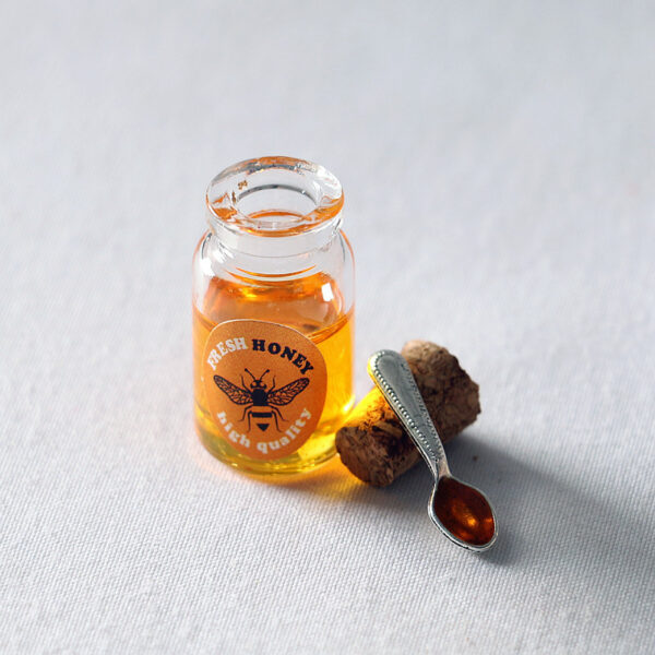The jam jar with a cork and a spoon is a beautifully designed small model created specifically for miniature scenes, commonly used to decorate the kitchen, dining table, or food display areas in a dollhouse.