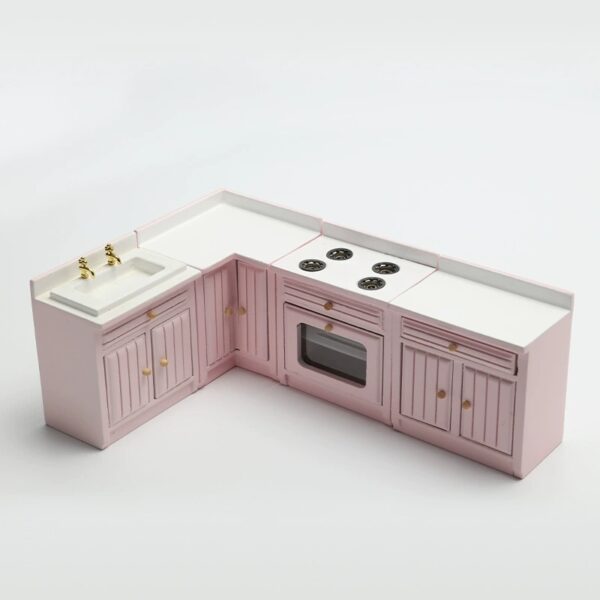 The dollhouse kitchen furniture set is an L-shaped kitchen model specifically designed for miniature scenes. With exquisite craftsmanship and realistic details, it features a simple and modern style, suitable for 1:12 scale dollhouses.