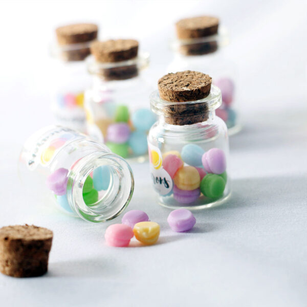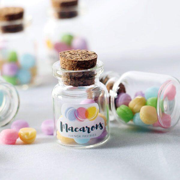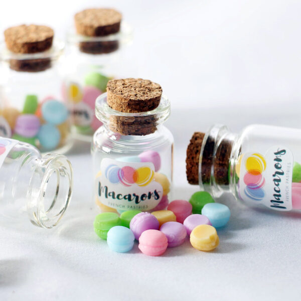 The macaron jar, with 12 macarons in it, is a transparent glass bottle designed to resemble a real jar, complete with a wooden cork and a label.