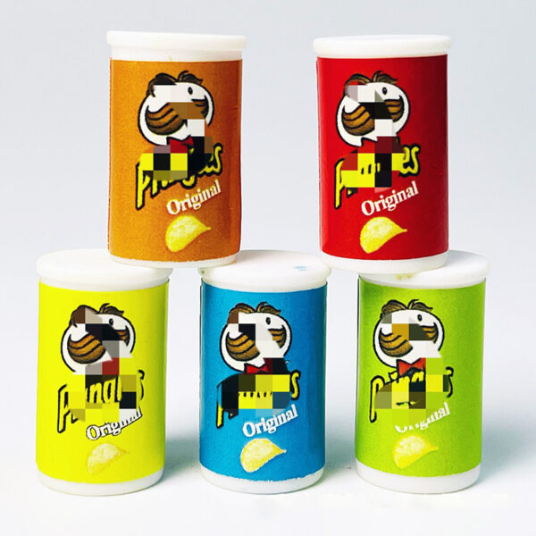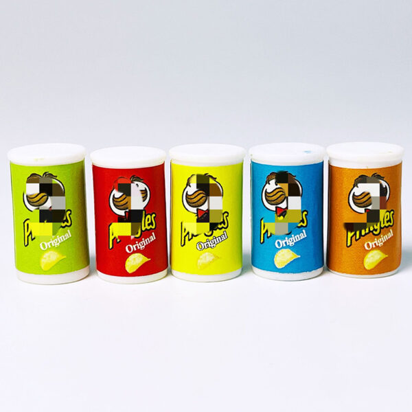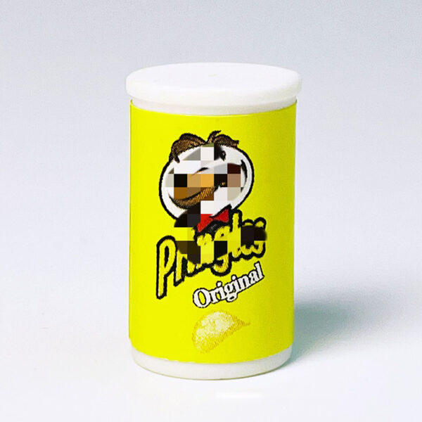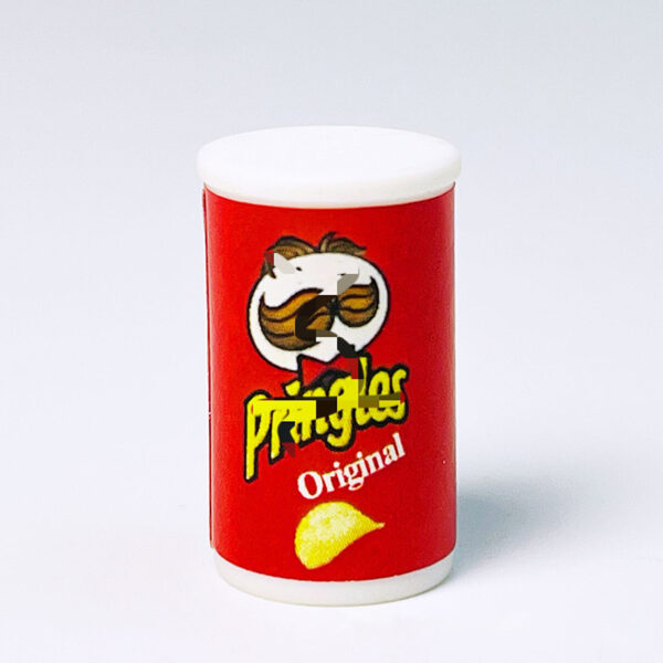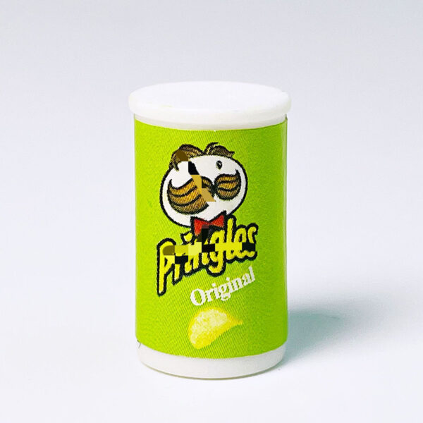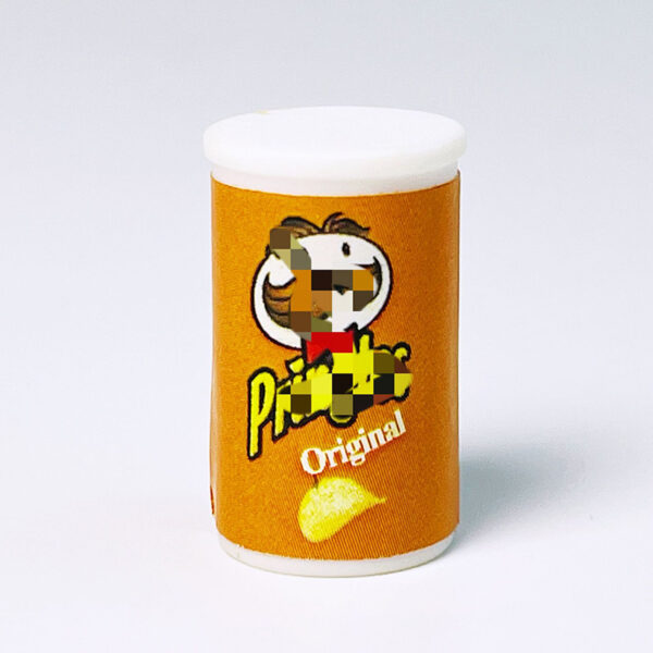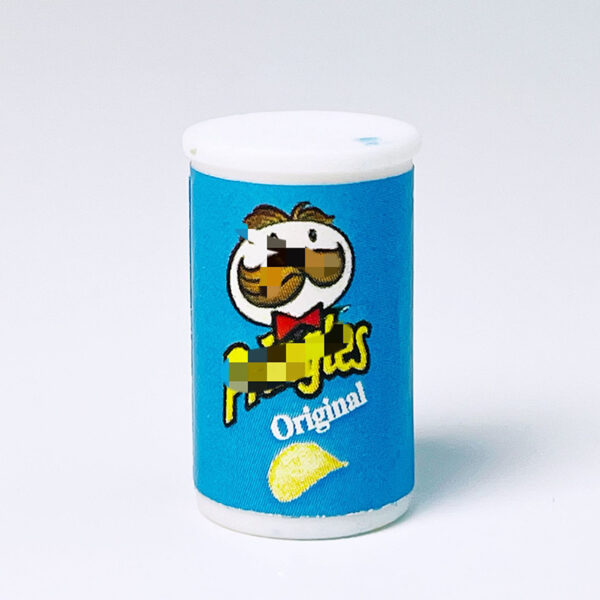 The miniatures are canisters of potato chips resembling popular snack packaging. These small replicas are colorful and highly detailed, with the design mimicking the branding of a well-known chip brand.