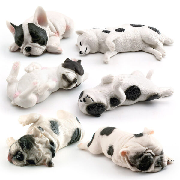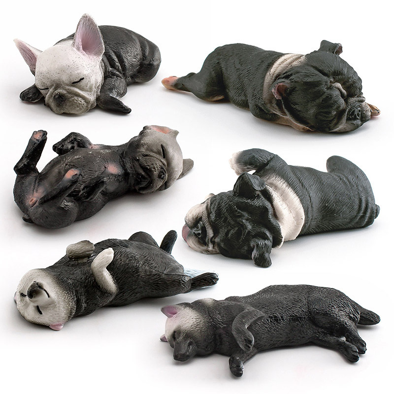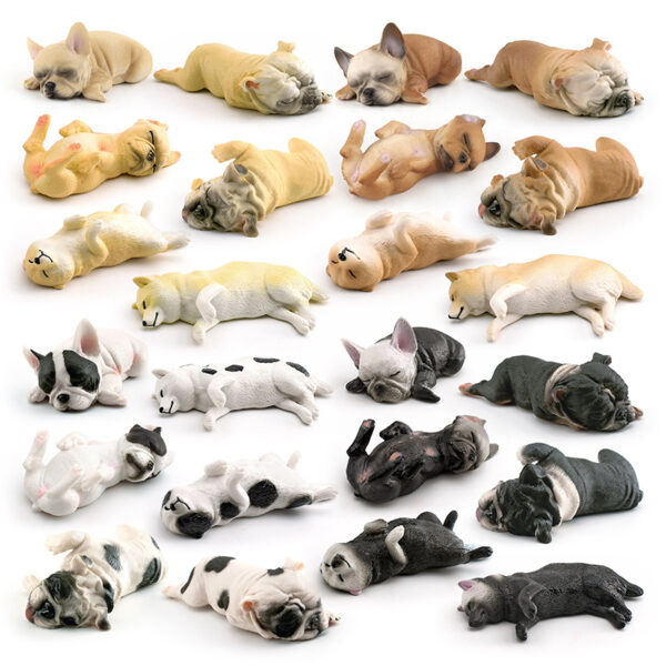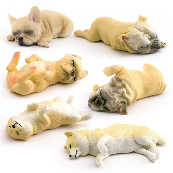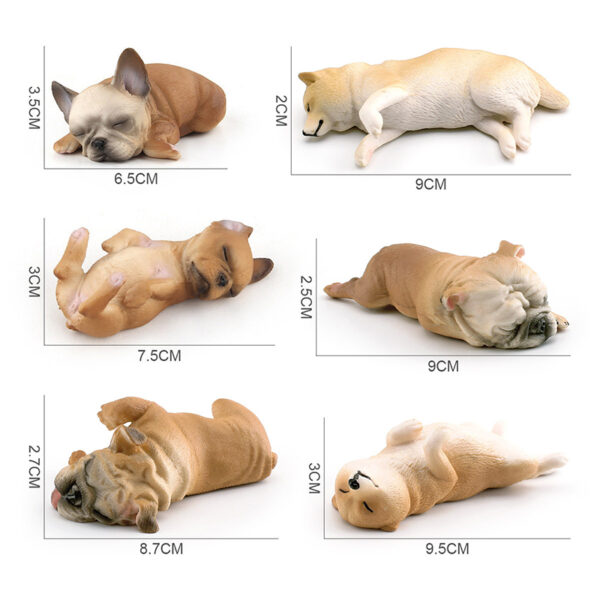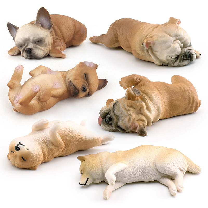 These are PVC realistic miniature sculptures of sleeping Bulldog puppies and Shiba Inu puppies, carefully hand-painted to create an adorable and lifelike appearance.