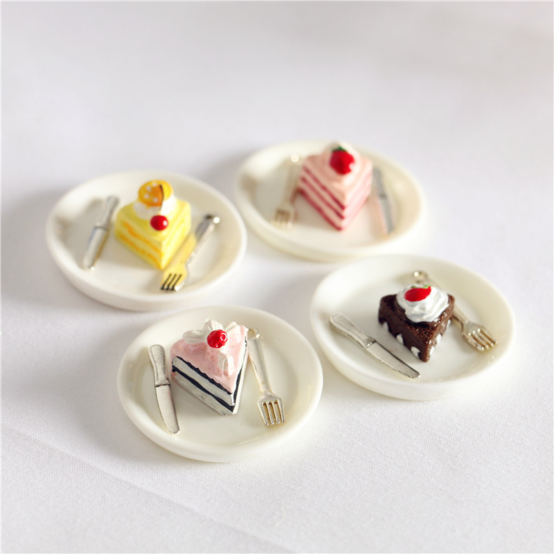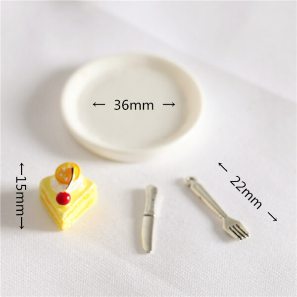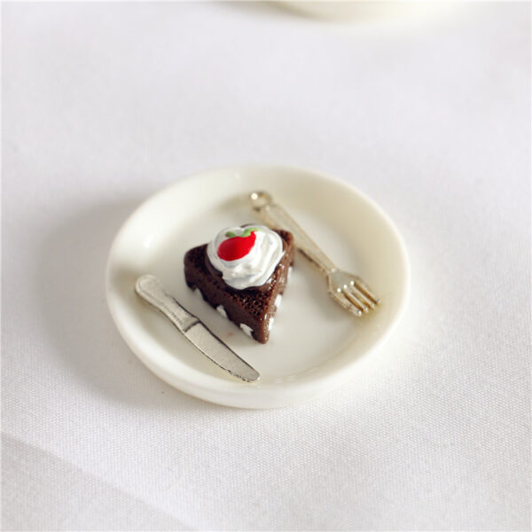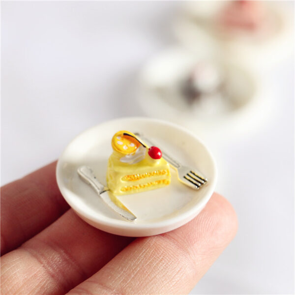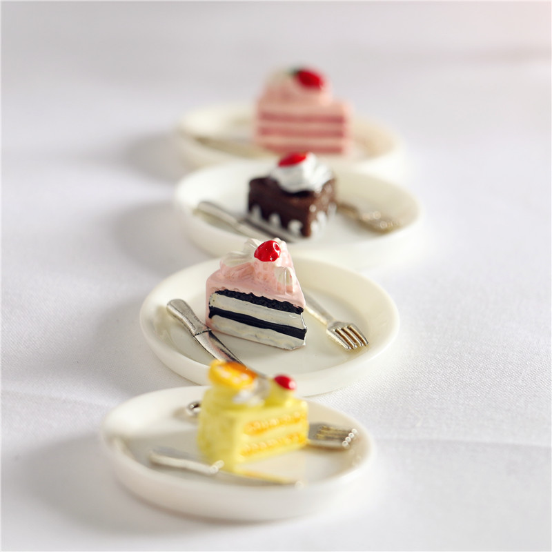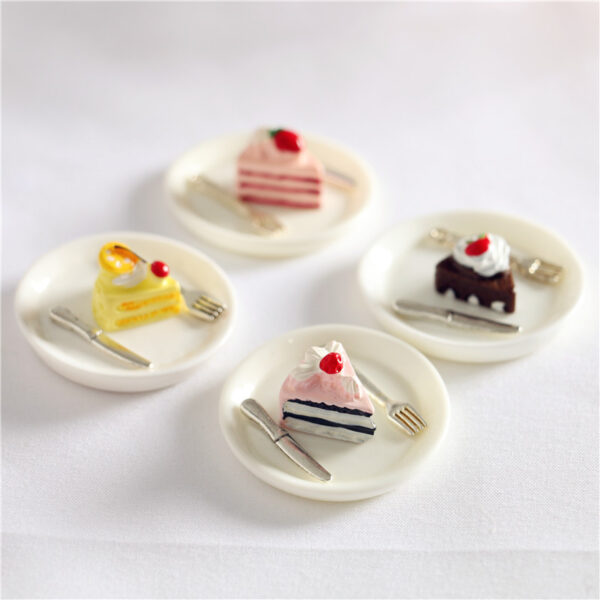 There are 4 types of sliced cream cakes available for selection. The cake comes with a plate, a fork, and a knife to enhance the realism and interactivity of the dollhouse scene.