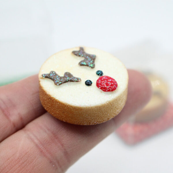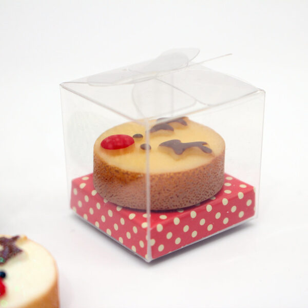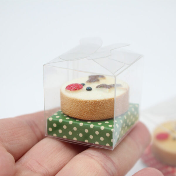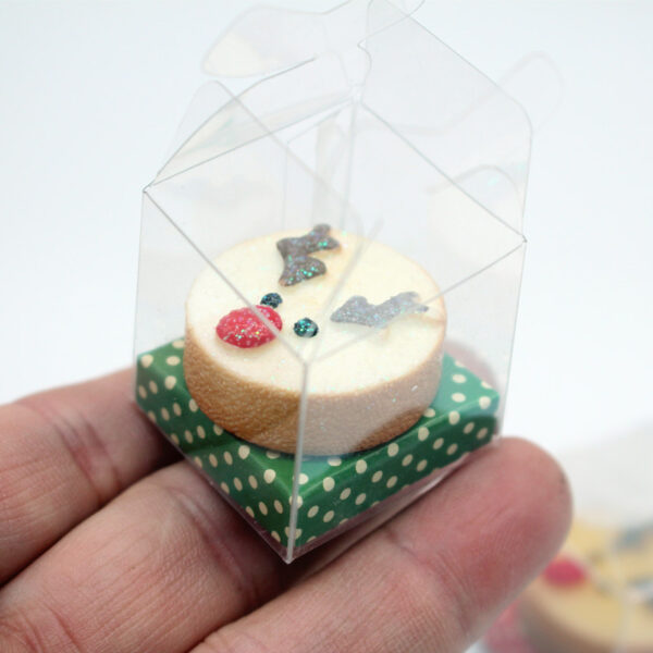 The transparent boxed Christmas reindeer cake is a miniature dessert model inspired by classic Christmas elements. It includes a mini Christmas reindeer cake, a square base, and a plastic box.