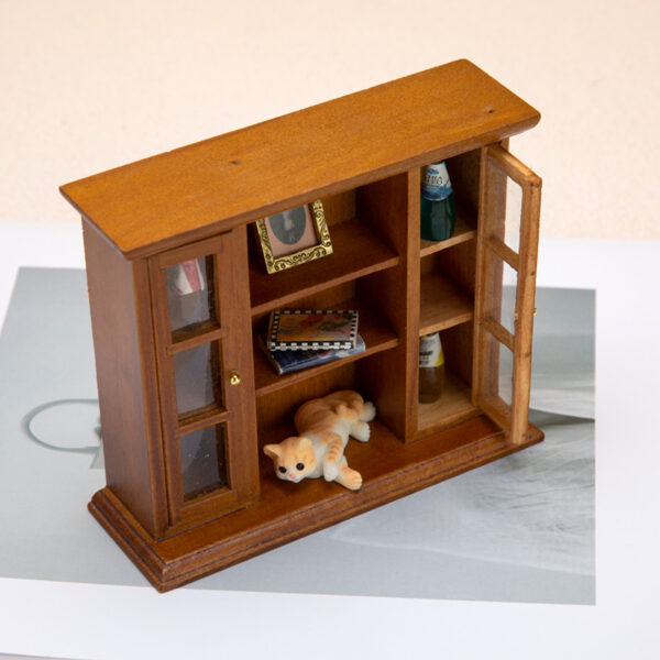The wooden sideboard cabinet features glass doors and two spacious shelves, specifically designed for 1:12 scale dollhouses and ideal for displaying small collectibles or decorative items.